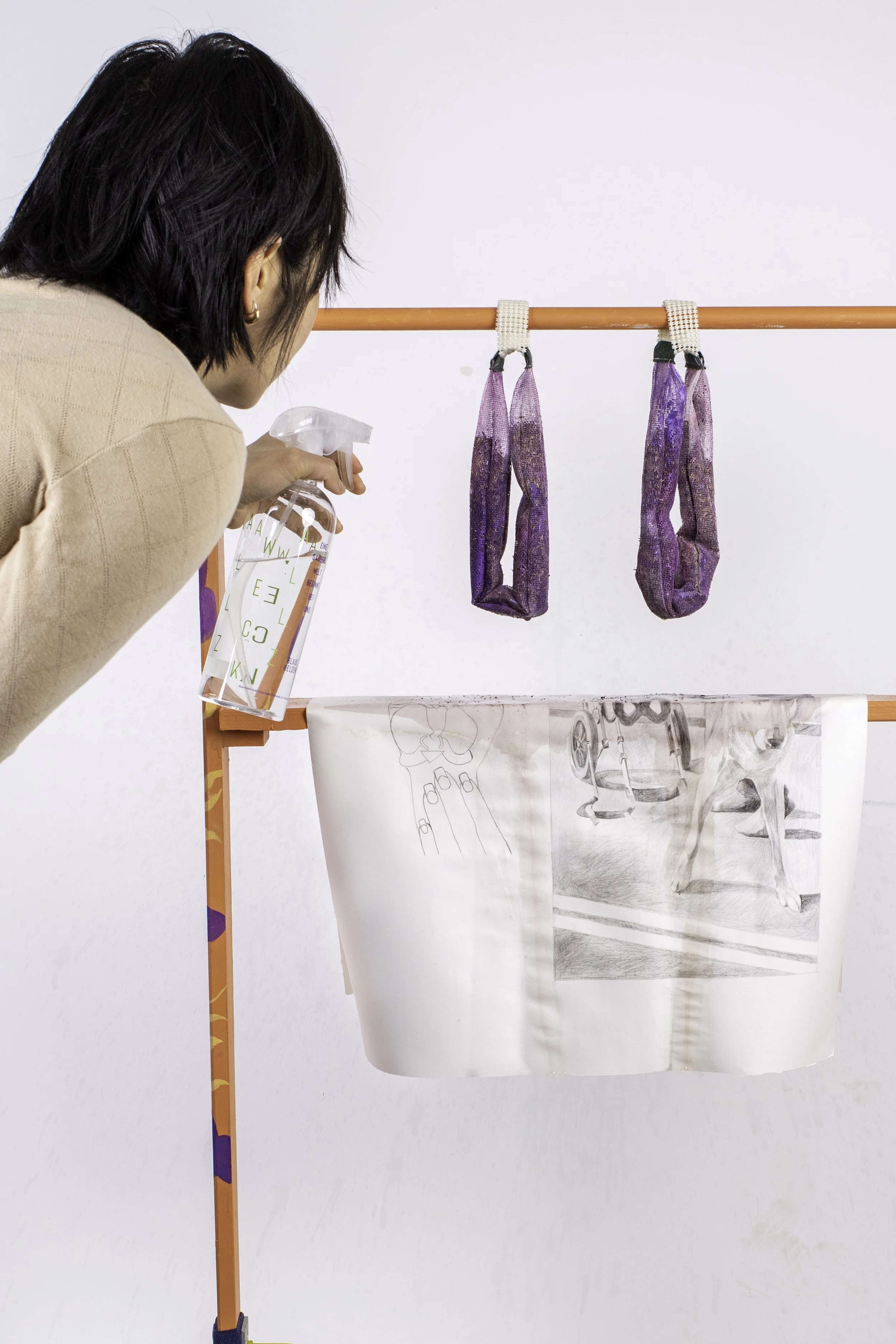 Like other works in this series, A Cure, A Cure, A Mani-Cure uses the language of care to ponder its violence. The grass seeds embedded in the work is watered daily until they sprout, but this very process also destroys the drawing.